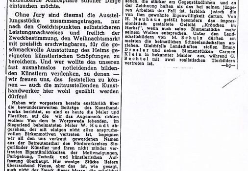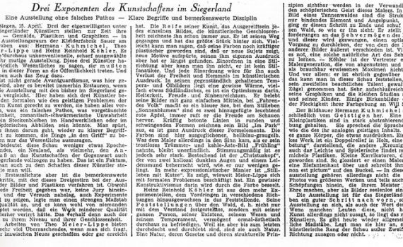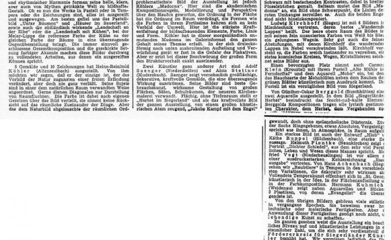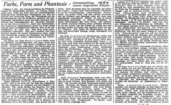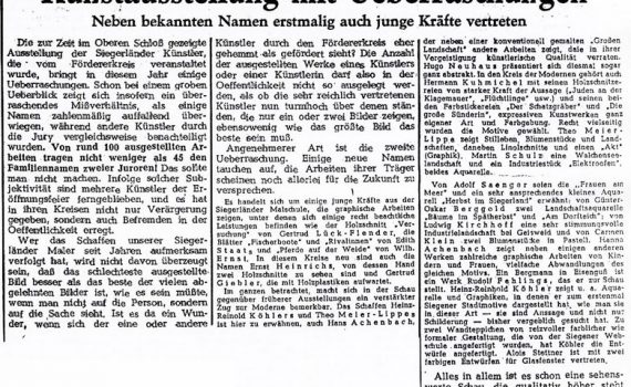 Ständige Kunstausstellung …-…1950 Theo Meier-Lippe · Hans Achenbach · Hanna Achenbach-Junemann · Emmi Dresler · Ludwig Kirchhoff · Carmen Klein · Heinz Rheinhold Köhler · Adolf Saenger · Martin Schulz Verkehrsverein Siegen PDF-Download: 1950_ASK_Verkehrsverein_Siegen Pressestimmen Tageszeitung 1950 Tageszeitung 1950