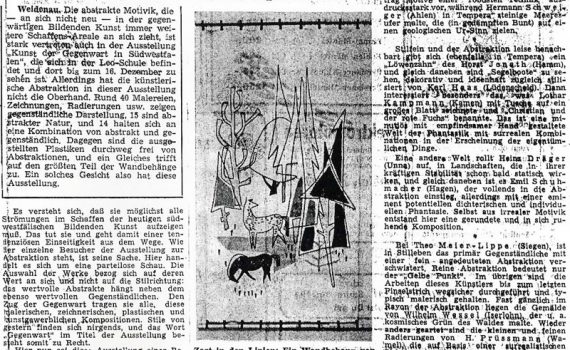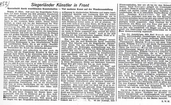 Winterausstellung Theo Meier-Lippe · Martin Schulz · Hans Achenbach · Ludwig Kirchhoff · Hanna Achenbach-Junemann · Emmi Dresler · Carmen Klein · Heinz-Reinhold Köhler · Robert Lixfeld Verkehrsverein am Bahnhof Siegen PDF-Download: 1951-09_ASK_Winterausstellung Pressestimmen Tageszeitung September 1951 Tageszeitung 19.09.1951 Tageszeitung September 1951