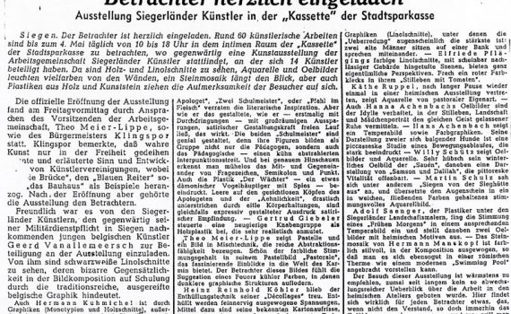 Frühjahrsausstellung 22.04 – 04.05.1955 Theo Meier-Lippe · Geerd Vanallemeersch · Hermann Kuhmichel · Gertrud Giebeler · Heinz-Reinhold Köhler · Ludwig Kirchhoff · Elfriede Pflänging · Käthe Ruppel · Hanna Achenbach-Junemann · Hans Achenbach · Willi Schütz · Martin Schulz · Adolf Saenger · Hermann Manskopf Kassette der Stadtsparkasse Siegen […]