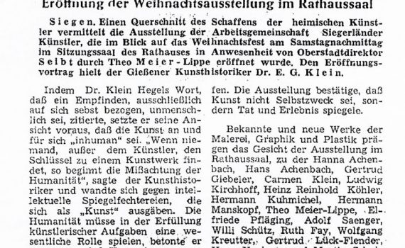Weihnachtsausstellung 02.11. – 14.12.1954 Hermann Kuhmichel · Gertrud Giebeler · Rudolf Fehling · Heinz-Reinhold Köhler · Alois Stettner · Hugo Neuhaus · Theo Meier-Lippe · Gertrud Lück-Flender · Hanna Achenbach-Junemann · Hans Achenbach · Martin Schulz · Adolf Saenger Ausstellungsräume des Oberen Schlosses Siegen PDF-Download: 1954-11_ASK_Weihnachtsausstellung Pressestimmen Tageszeitung 13.12.1954 […]