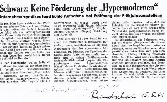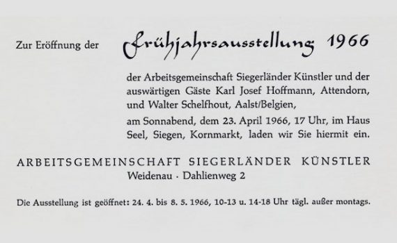 Frühjahrsausstellung 23.04. – 08.05.1966 Hanna Achenbach-Junemann · Hans Achenbach · Werner Brach · Walter Helsper · Theo Meier-Lippe · Willi Schütz · Martin Schulz · Friedrich W. Stein Gäste: Ruth Hoffmann · Karl Josef Hoffman · Walter Schelfhout Städtische Galerie Haus Seel, Siegen PDF-Download: 1966-04_ASK_Frühjahrsausstellung Pressestimmen Siegener Tageszeitung […]