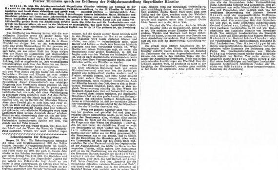 Frühjahrsausstellung 26.05. – 07.06.1962 Hanna Achenbach-Junemann · Hans Achenbach · Werner Brach · Gertrud Giebeler · Ludwig Kirchhoff · Hermann Kuhmichel · Gertrud Lück-Flender · Theo Meier-Lippe · Elfriede Pfläging · Käthe Ruppels · Martin Schulz · Willi Schütz Städtische Galerie Haus Seel, Siegen PDF-Download: 1962-05_ASK_Frühjahresausstellung Pressestimmen Siegener Zeitung […]
