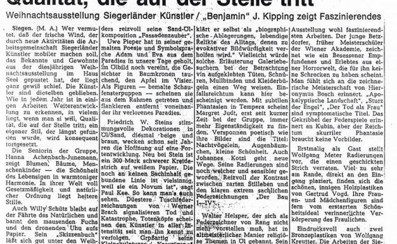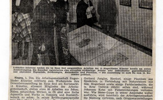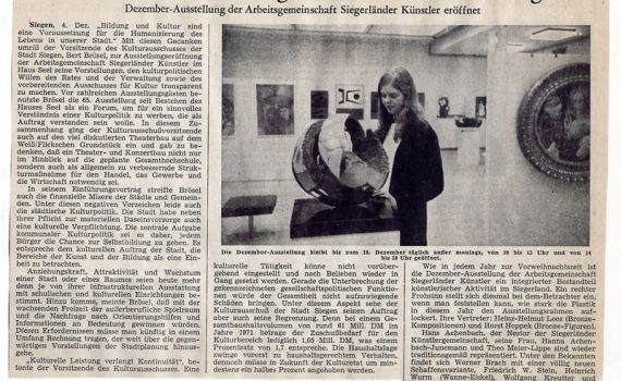 Dezember-Austellung 28.11. – 14.12.1975 Gerhard Junglas, Johannes Kotzi, u. 11 a. Künstler Städtische Galerie Haus Seel, Siegen PDF-Download: 1975-11_ASK_Dezemberausstellung Pressestimmen Siegener Zeitung 01.12.1975