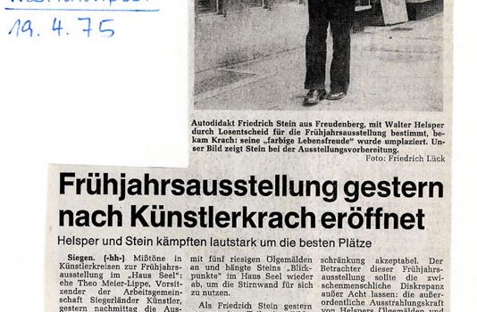 Frühjahrsausstellung 18.04. – 09.05.1975 Walter Helsper und Friedrich W. Stein Städtische Galerie Haus Seel, Siegen PDF-Download: 1975-04_ASK_Frühjahresausstellung Pressestimmen Westfalenpost 19.04.1975 […]