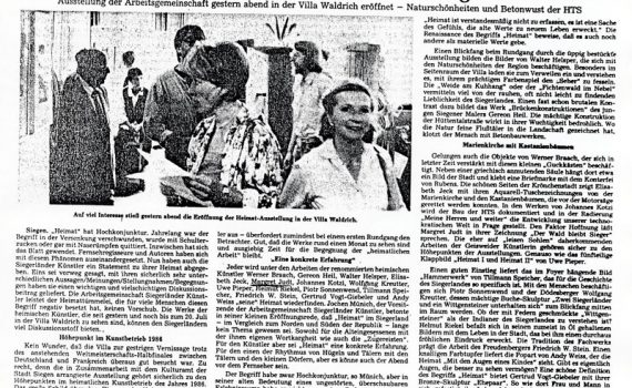 Heimat Meine Heimat, meine Umwelt – Künstler sehen das Siegerland 25.06. – 20.07.1986 Werner Brach · Walter Helsper · Elisabeth Jeck · Margret Judt · Johannes Kotzi · Wolfgang Kreutter · Uwe Pieper · Helmut Riekel · Piotr Sonnewend · Tilmann Speicher · Friedrich W. Stein · Gertrud Vogd-Giebeler · […]
