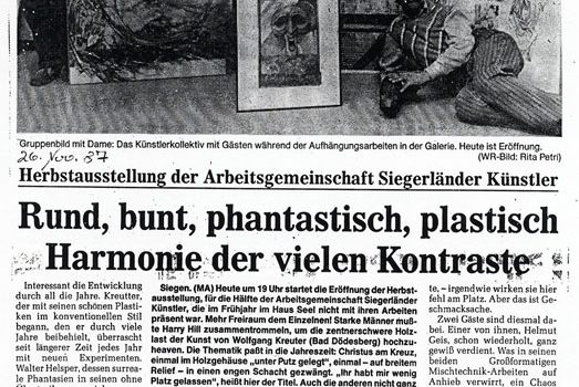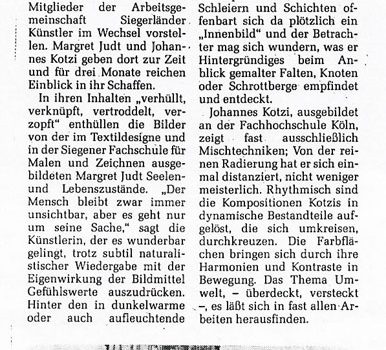Arbeitsgemeinschaft Siegerländer Künstler 29.11.1988 – 04.02.1989 Margret Judt · Johannes Kotzi Haus der Siegerländer Wirtschaft Pressestimmen Westfälische Rundschau 19.11.1988