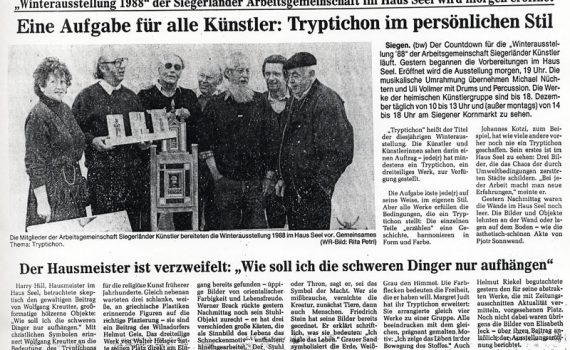 „Tryptichon“ Winterausstellung 24.11. – 18.12.1988 Werner Brach · Walter Helsper · Margret Judt · Elisabeth Jeck · Johannes Kotzi · Helmut Geis · Stefan Matlik · Helmut Riekel · Friedrich W. Stein · Tilmann Speicher · Gertrud Vogd-Giebler · Wolfgang Kreutter · Piotr Sonnewend Städtische Galerie Haus Seel, Siegen […]