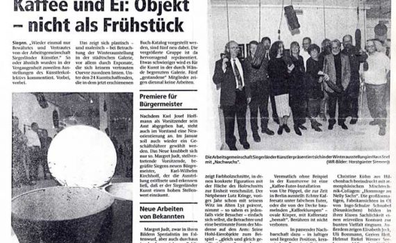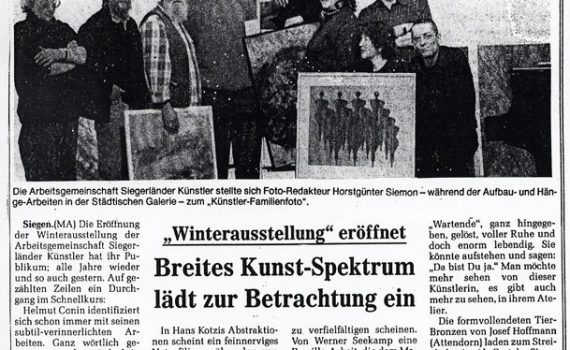 Winterausstellung 29.11. – 23.12.1990 Helmut Geis · Walter Helsper · Karl Josef Hoffmann · Margret Judt · Hans Kotzi · Elisabeth Jeck · Werner Seekamp · Friedrich W. Stein · Gertrud Vogd-Giebeler Gast: Rudolf Bieler Städtische Galerie Haus Seel, Siegen PDF-Download: 1990-11_ASK_Winterausstellung Pressestimmen Westfälische Rundschau 30.11.1990