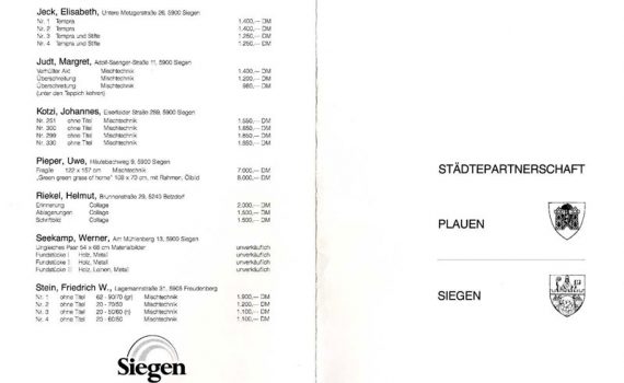 Städtepartnerschaft Plauen – Siegen 16.05. – 09.06.1991 Künstler der Stadt Plauen Jürgen Adler · Rolf Andiel · Horst Endesfelder · Manfred Feiler · Liesel Fischer · Ina Fitzer · Karin Helbig · Klaus Helbig · Dietrich Kelterer · Adelheid Liebetrau · Peter Luban · Dr. Rolf Magerkord · Detlef […]