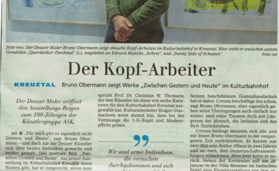 Im Mai findet neben zwei Einzelausstellungen auch der Festakt zum Jubiläumsjahr statt. Daran anschließend wird die große ASK-Mitgliederausstellung im Haus Seel eröffnet: 06/05 – 04/06PAPIERARBEITEN * Bruno Obermann * MalereiHotel im Auerbachtal * Wiesenweg 5 * 57334 Bad Laasphe-FeudingenInformation: 02737/1519 * obermann@freenet.de * www.brunoobermann.de 08/05 – 22/05QUERDURCH * Mustafa Kizilcay […]
