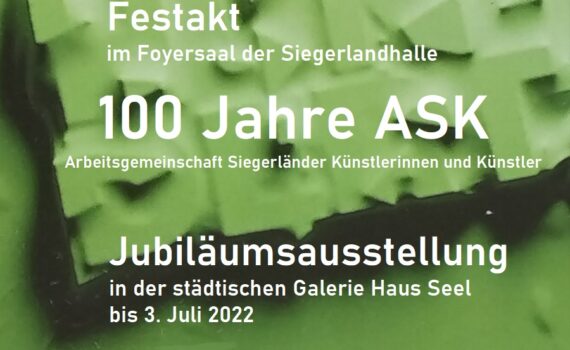 Festakt zum 100-jährigen Jubiläum der Arbeitsgemeinschaft Siegerländer Künstlerinnen und Künstler 29.05.2022, 11 Uhr Foyersaal der Siegerlandhalle Begrüßung: Steffen Mues * Bürgermeister der Universitätsstadt SiegenAndreas Müller * Landrat des Kreises Siegen-WittgensteinThomas Mehrer * Erster Vorsitzender der ASKN.N. * LWL-KulturstiftungVortrag: Wolfgang SuttnerMusikalische Begleitung: Peter Autschbach, Samira Saygili Bis hierhin und weiter. 100 […]