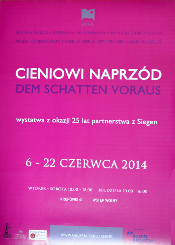 Artbridge! Mit der Ausstellung „Cieniowi Naprzód“ („Dem Schatten voraus“) stößt die Arbeitsgemeinschaft den Austausch zwischen den beiden Partnerstädten Zakopane und Siegen auf der künstlerischen Ebene an. Die von beiden Städten unterstützten kulturellen Projekte sind wichtige Bestandteile der Jubiläumsveranstaltungen der Partnerstädte. So war es den Künstlerinnen und Künstlern der Arbeitsgemeinschaft immer auch ein Anliegen, sich durch Artbridge mit den eigenen künstlerischen Brücken einzubringen. Neben dem Austausch mit den deutschen Städten Plauen und Spandau war in der Vergangenheit die Planung sowie die Durchführung der Kunstprojekte mit Leeds (England), Deyang (Volksrepublik China) und Katwijk (Holland) von Bedeutung. So kann der künstlerische Austausch als Fundament der Kulturschaffenden mit den städtischen Institutionen angesehen werden. Dieses Jahr werden neben den vielfältigen Programmpunkten der Jubiläumsveranstaltungen auch die beiden Ausstellungen in Siegen und in Zakopane von Interesse sein.