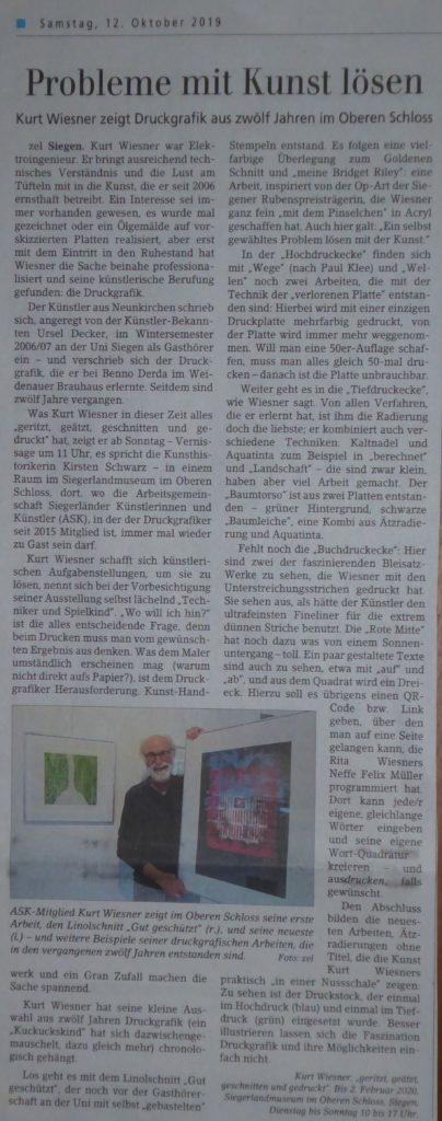 Er trägt den Titel der Aussstellung: „Kurt Wiesner – geritzt, geätzt, geschnitten und gedruckt“.