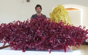 Da Kristian Kosch auch Maler ist, liegt der Beginn vieler Plastiken in einer „gemalten“ Fläche: Er gießt die Gelatine auf eine Folie, wo sie erstarrt und sich dabei verformt. Der Beginn der Dreidimensionalität ist gemacht … Diese getrocknete Fläche „erntet“ er, wie er es formuliert, und fügt sie mit anderen zusammen, fast ein meditativer Akt, die Formen ergeben sich in einem beinahe spielerischen Prozess, denn die Formen finden nahezu selbsttätig ihren Platz in den Gebilden, deren Erscheinungsbild sich wiederum aus den Vorgaben der kleinen Module ableitet. So zeigt Kristian Kosch ein tiefrotes Gebilde, einem Ufo gleich (oder ist es ein Kranz, eine Krone, ein Nest oder ein Stadtmodell?), das in leicht unregelmäßigen Bewegungen mit einzelnen Streifen in die Luft über sich hinaus zu greifen scheint.
