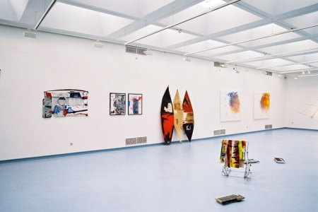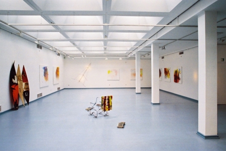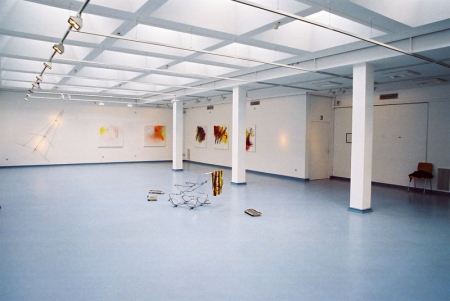 Diese Kraft, auch in der Reduktion, beherrscht auch die anderen neuen Obermanns. In »Knospe bricht« stellt er zum Beispiel aufbrechende rote Knospen dar, die sich wie befreit, flügelähnlich, lösen aus der Umgebung, die in heller, gelber Leichtigkeit den anscheinend fragilen, aber dennoch widerstandsfähigen Untergrund bildet. Befreit von den »Zwängen des Materials« wirken auch die Arbeiten von Eckard Putzmann und Uli Bossmann. Eckard Putzmann zeigt u. a. neue Arbeiten in Stahl – einen Flieger aus Stahldraht, der wie ein Papierflieger konstruiert ist, aber eben aus Stahldraht ist. Er malt das Gerüst des Fliegers, die Idee des Fliegens, als Schatten auf die Wand. Eine mehrfach gebrochene und gleichzeitig höchst wirkungsvolle Reflexion der Materialität des Malens. Ähnlich geht er in den »unfertigen« Quadraten aus Draht vor, die erst im Kopf des Betrachters vervollständigt werden und dennoch »völlig« vorhanden sind.