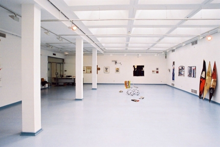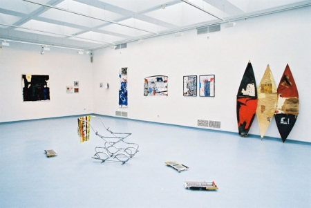 Uli Bossmanns Arbeiten, die von seiner Schwester Gabriele ausgesucht worden sind (Uli Bossmann hat dem Ausstellungsvorhaben noch begeistert zugesagt, sein allzu früher Tod zu Jahresbeginn verwehrte ihm allerdings die Umsetzung), geben einen Überblick über verschiedene Schaffensperioden, wobei in allen Arbeiten sein Witz und der Wunsch nach der »Gestaltung der Freiheit« sichtbar werden. Das Hubschrauber-Objekt mit einer Handlaternen-Kapsel, die drei Drachen aus Zeitungspapier und/oder Tuch, die wie atavistisch anmutende Schilde der Gefahr zu trotzen scheinen und gleichzeitig so zerbrechlich wirken, wie sie sind, die schwarz dominierte Teer-Arbeit »Unter Tage«, die die Farbe in die Tiefe holt, die fragilen Faden-Leitern, die der anderen Arbeit Halt geben und einen Ausweg anbieten – die Arbeiten spielen mit dem Material und weisen ihm neue Bedeutung – und neue Möglichkeiten – zu. Eben weil die Tomaten auch gelb sind!
