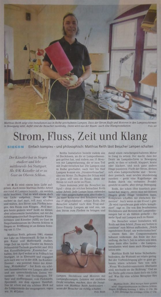 Die Installation zeigt wie das Häusliche banal und speziell gleichzeitig ist und spielt mit unseren Erwartungen. Man erwartet vielleicht gerade von Dingen des Alltags mit denen wir unseren Tag beginnen und auch schließen nicht viel, sind es doch Profanitäten, die man in- und auswendig kennt und ständig benutzt. Gleich sieht man in dieser Installation jedoch leichte Störungen des Bekannten und die vermeintliche Sicherheit beginnt zu schwinden. Ein Draht, ein Kabel, dass nicht sein soll wo es ist. In vielen von Matthias Reiths künstlerischen Arbeiten wird in den Arbeiten ausgehandelt, welche Themen in welchen Bereichen Vorrang haben. So entstehen Gebilde, die schon lange in den Köpfen sind. Die Objekte werden neu in Zusammenhang gebracht, leicht verändert und so wirken sie bekannt und überraschend gleichzeitig. Ideen werden in Material übersetzt, sie werden deutlicher und gleichzeitig obskurer. Scheinbar bekannte Funktionen beginnen durch diese künstlerische Intervention ein neues Eigenleben. Und so kann man diese Installation auch als eine Einladung dazu begreifen, darüber nachzudenken was man sieht, hört und tut, wenn man der Installation aktiv begegnet sowie darüber nachzudenken wie sich hier in diesem Kreislauf, der keiner ist, dieser Kette, die nur manchmal eine ist, die Katze in den Schwanz beisst. Der feine Humor wird auch deutlich, wenn man sich die technischen Begebenheiten die Matthias Reith erfand, baute und inszenierte genauer anschaut. Der Kontext der Lampe wird verschoben, man wird überrascht und herausgefordert