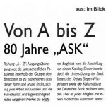 Die ASK ist eine der ältesten noch bestehenden Künstlergruppen Deutschlands. Ihre Wurzeln gehen bis in das Jahr 1922 zurück. Über Jahrzehnte fanden sich unter den Mitgliedern Künstlerinnen und Künstler, die das Kunstgeschehen in der Region maßgeblich mitgestaltet haben …